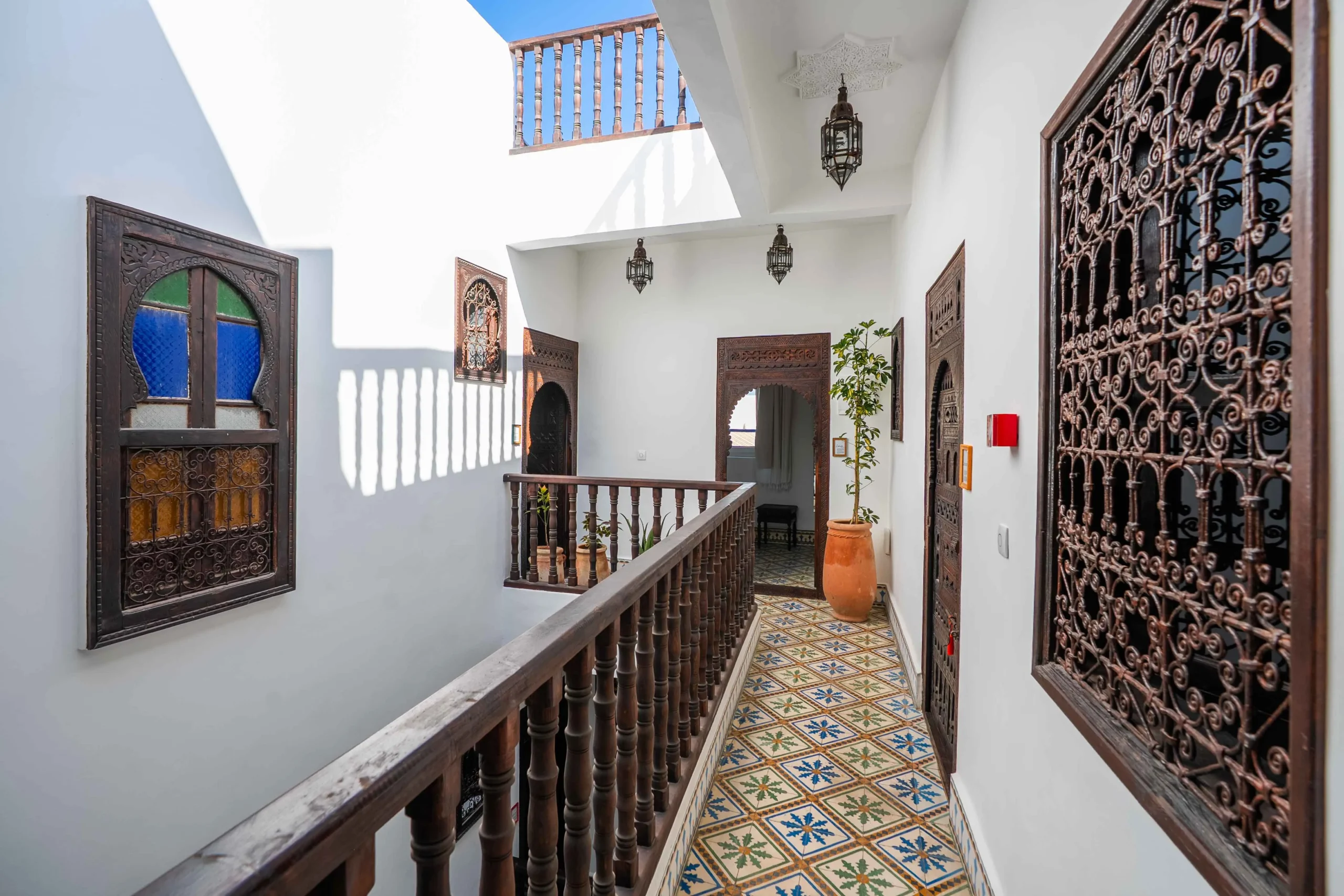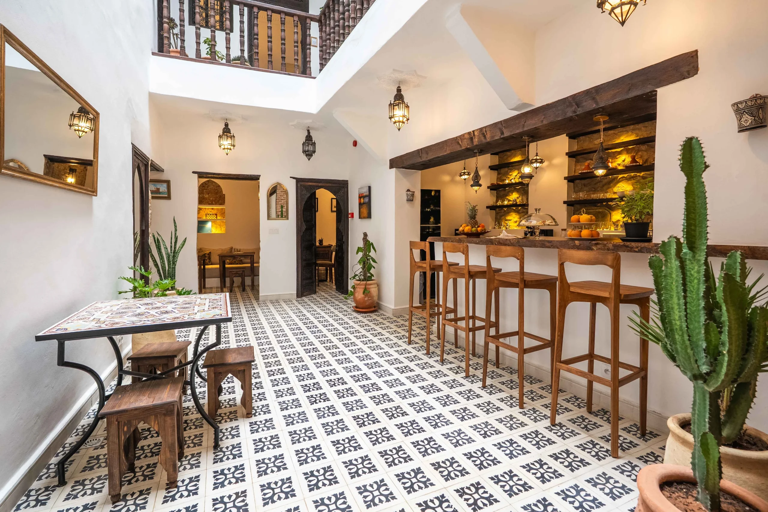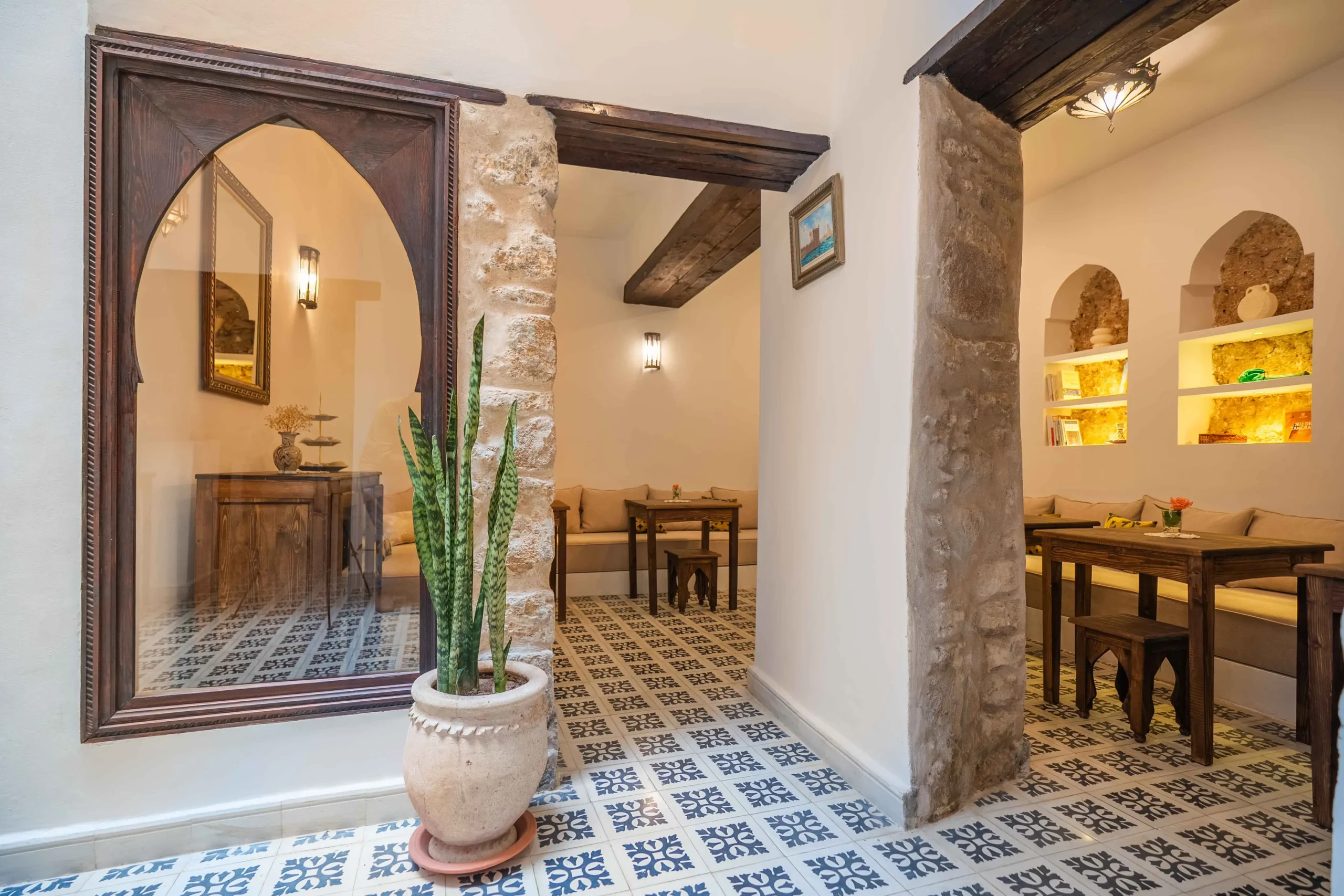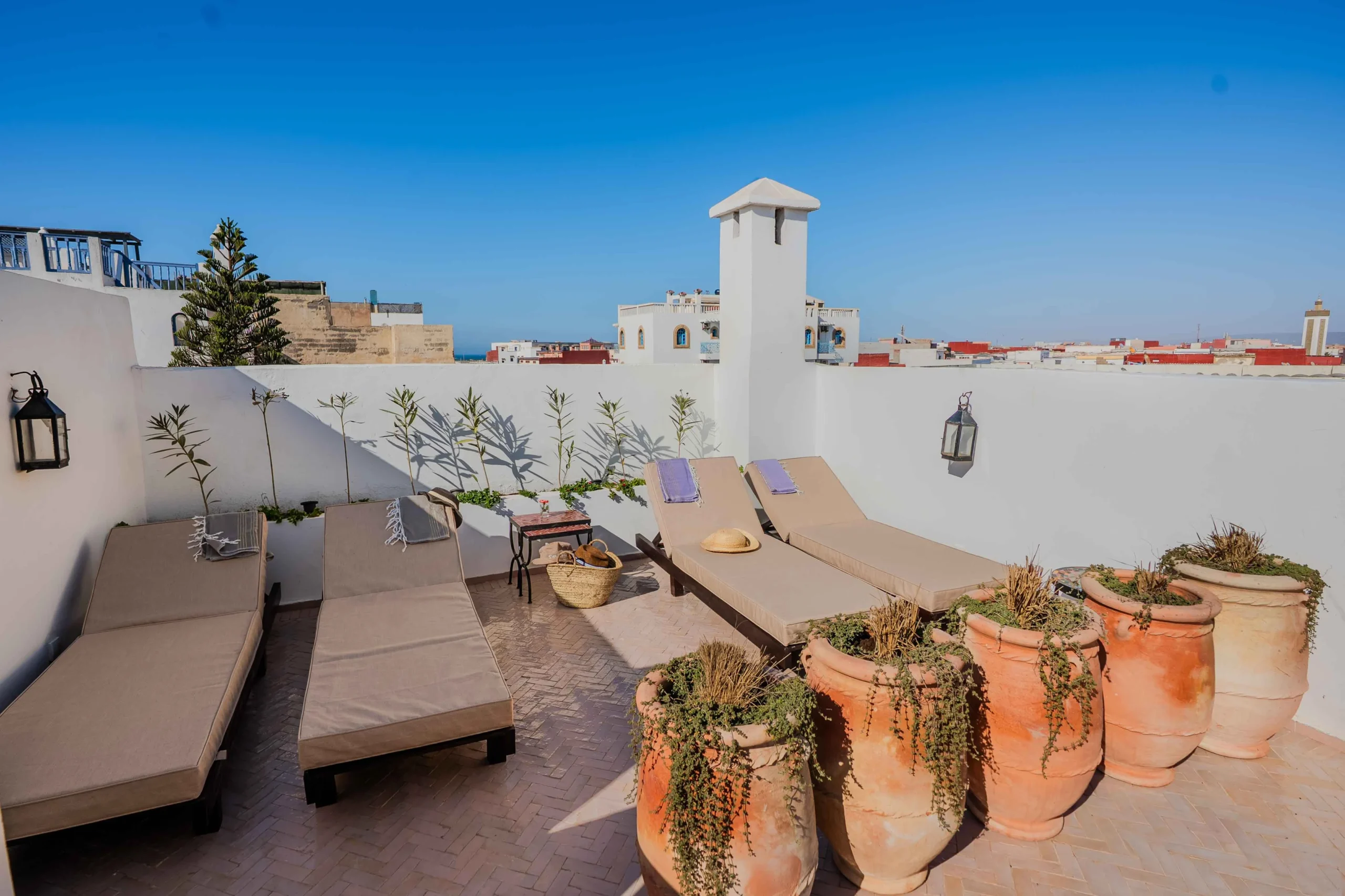 Le riad reflète la simplicité élégante des habitants d’Essaouira, connus pour leur hospitalité naturelle. Ici, chaque détail a été choisi avec soin pour rendre hommage à l’art de vivre marocain. La décoration mêle matériaux bruts et touches artisanales, entre zelliges traditionnels, bois sculptés à la main et tissus naturels. Chaque objet raconte une histoire, souvent celle d’un artisan local dont le savoir-faire traverse les générations.